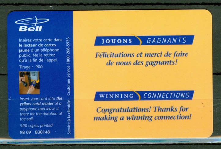 Bell Canada; Winning Connections; telephone card in a good condition; contains NO money value; a collectible object only. --- See the section Shipping & returns.