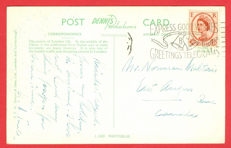Piccadilly Circus, London, U.K.; nice cancel on the bell thematic; post card. --- See the section Shipping & returns.