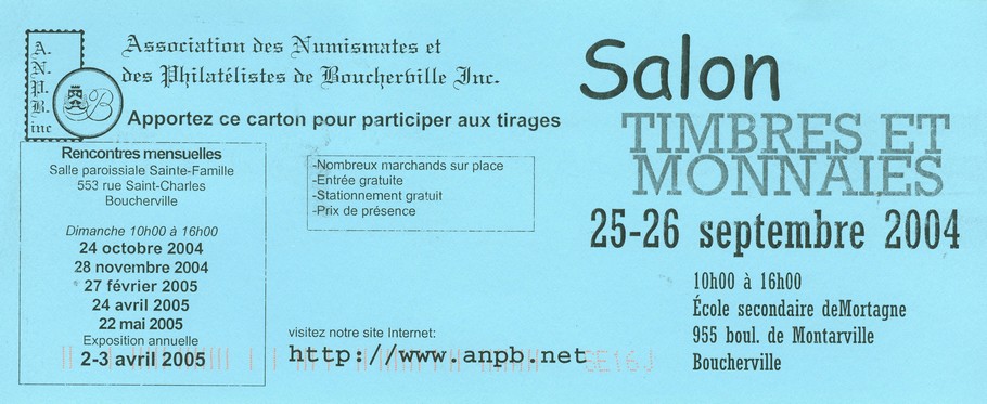 Boucherville QC; Salon timbres et monnaies 2004; doctor Jennie Trout; Colombo Plan; invitaton card that went tru mail; Canada, Scott stamps # 360 + 391 + 1302; see also item # 5183. --- See the section Shipping & returns.